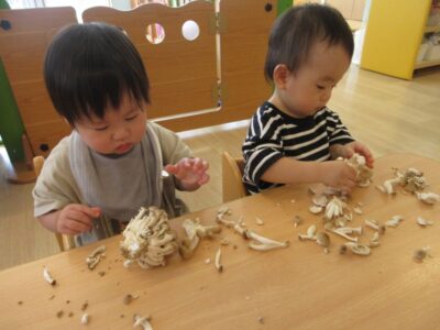 【すみれ保育園】しめじに触ってみよう!~もも組~