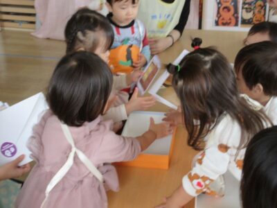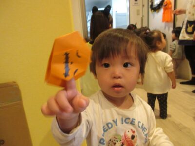 貰った折り紙を先生たちに「みて~」「かぼちゃ!」と嬉しそう✨