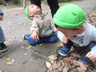 ある日は落ち葉を拾って遊んでいると何かを発見しました。