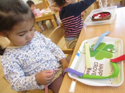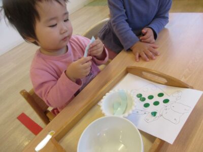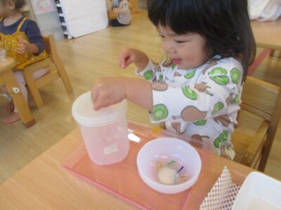 モンテッソーリ教育の教具をつかった「おしごと」を、登園後に行うことが多いのですが、今回は「おしごと」に夢中になっている姿をご紹介したいと思います!