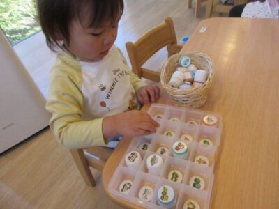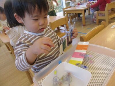 指先の力を使っておはじきを穴へ押し込んだり、洗濯ばさみを同じ色のところへ挟んだりしています。色にも興味が出てきて「あか」「あお」など声に出しながら洗濯ばさみを挟んで楽しむ姿も★