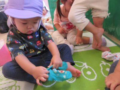 たんぽぽ組さんでは、「自分でやってみたい!」という気持ちがぐんと育ち、靴下をはくことにも挑戦してみました。
