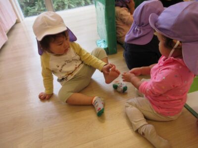 靴下を渡したり、引っ張ってあげようとかかわる姿に、お互いを思いやる気持ちの育ちも感じられました✨
