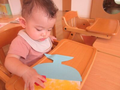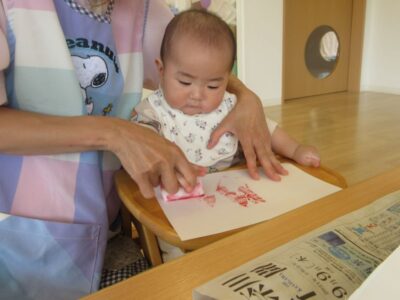 絵の具が初めてのお友達は、保育士と一緒にスタンプをしました。