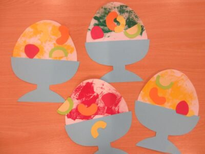 スポンジに絵の具を付けて画用紙にペッタン!