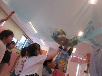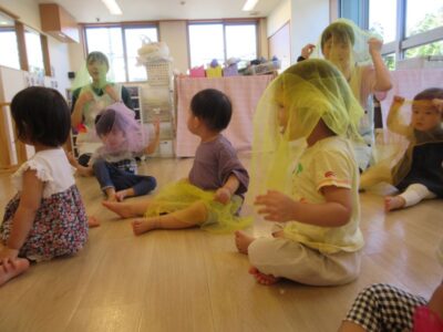 最後に大きなシフォンを使ってみんなの上で「ちゃぷちゃぷ」を歌うと「わ~」と楽しそうな笑顔^^