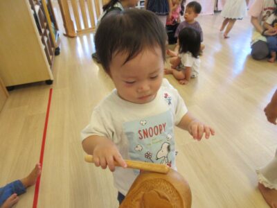 「どんぐりころちゃん」というわらべうたでは、歌詞に出てくる「どんぐり はちくり しょ」の「しょ」の部分に合わせて楽器を叩くことに挑戦!リズムに合わせてばっちりです^^