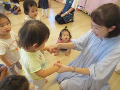 「ちゃぷちゃぷ」というわらべうたでは、先生と手を繋いで体を揺らすことに面白さを感じています♪