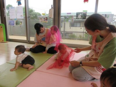 はじめはもも組でもよくやっている「じいじいばあ」を行い、オーガンジーから透けて見える先生たちの顔を見てにっこり♡布をひっぱり「ばあ!」と声をあげていました。