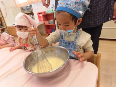 なるみ先生が小麦粉・卵・牛乳・バターを混ぜた後、子どもたちも順番に「まぜまぜ♪」