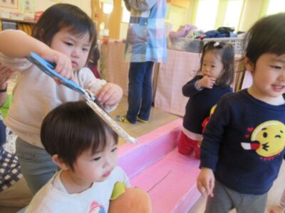 2月のお誕生日会でなつみ先生が披露した「美容室ごっこ」に興味を持ったようです。