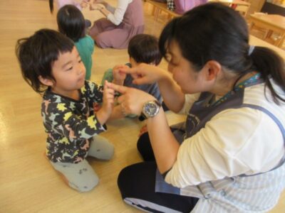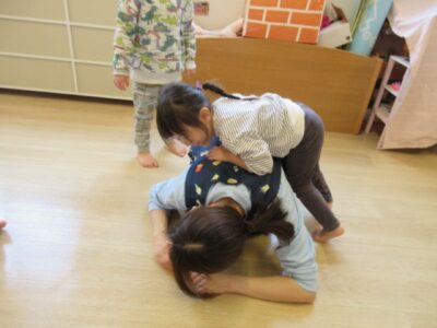 先生と一緒に指でツンツンしたり、先生が子どもたちをぎゅーっと抱いてかっぱ巻きになったり