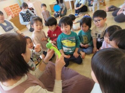 次は、講師の先生のおともだちの「いもむしくん」がやってきて、みんなでタッチ!してご挨拶♪