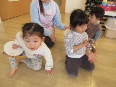 鈴、タンバリン、エッグシェイカー、どれも興味津々のゆり組さん。
